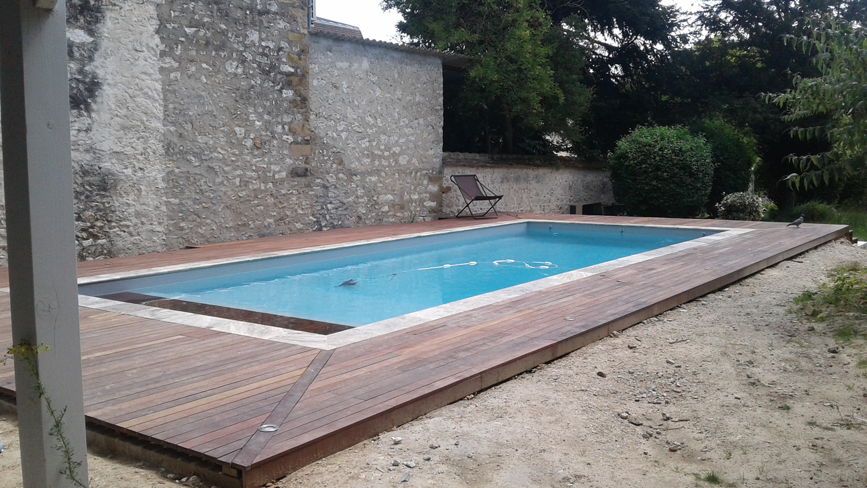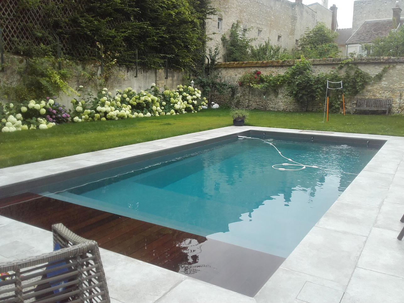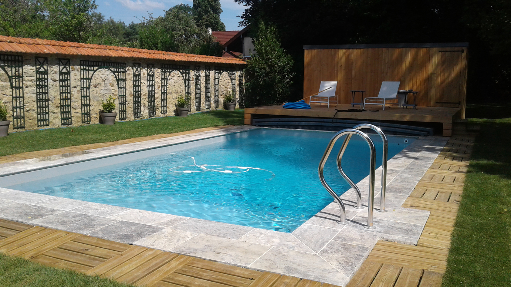 Piscine enterrée de 9,00 x 4,00 m, escalier, membrane armée 150/100 ième gris anthracite, filtration à sable avec GAROFILTRE, traitement automatique pour la désinfection par chlore liquide et pH, chauffage de l’eau par pompe à chaleur, robot automatique POLARIS, volet immergé avec caillebotis bois, margelle en pierre naturelle travertin, plage en bois IPE.
